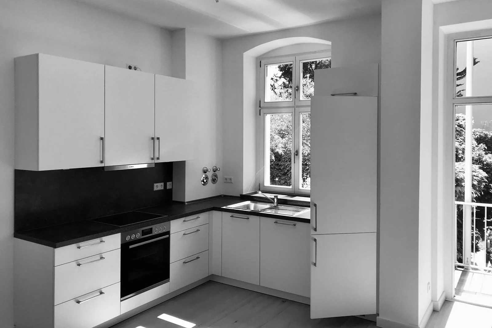 Ohne Eingriffe in die bauliche Struktur, Böden oder Wände lag der Fokus ausschließlich auf der Möbelplanung. Es entstand ein Raum, in dem jede Zone durch klare Blickachsen optimal auf den Garten ausgerichtet ist. Großzügige Fensterflächen – ein großes Balkonfenster und das Küchenfenster – lassen das Grün von außen in den Innenraum fließen und schaffen ein helles, luftiges Ambiente.